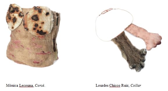 La elaboración de un corsé (hecho con papel de algodón, vendas, metal oxidado) como forma de agradecimiento por sentirse “femeninamente poderosa”, luego “de sentir que mi alma se iba degradando”, definió el trabajo de Mónica Lecouna (ibid.: 38-43). Un collar donde cuelgan dos garras de puma en cuero real se anuncia como doble agradecimiento a las fuerzas de la naturaleza y de las manos, humanas y no humanas, que recuerdan a la artista Lourdes Chicco Ruiz las de su hija jugando y las de su abuela descansando (idid.: 74-79). El poder creativo de las manos y el vínculo filial se revelan asimismo en el cuenco de madera con tachas y clavos que la artista Carolina Luzardo Carela realizó junto a su padre (ibid: 68 7368-73).