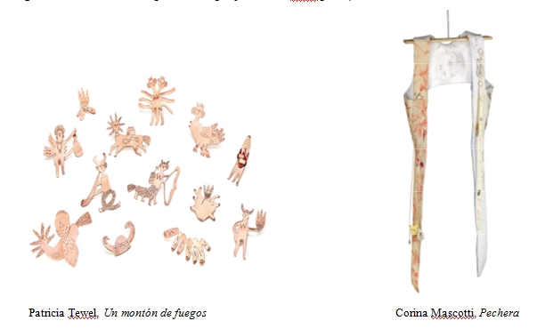 Los vínculos familiares, filiales y conyugales se enuncian también como recursos afectivos y mnemónicos en las obras de Paula Gallardo, que agradece en sus verduras de cerámica los cuidados de su abuela y la enseñanza del trabajo en la huerta, el bordado y la costura; o en la pechera y escapulario elaborados por Corina Masciotti con telas antiguas, trapos de pañal y cintas, recursos materiales para agradecer al “poderoso viaje evolutivo de la experiencia” de maternidad y su vínculo con su hijo de 6 años. También el broche de plata que evoca una corriente liquida, a partir del cual Rita Bamidele Hampton agradece a la naturaleza “por mostrarme esta maravilla del cuerpo: la lactancia” (bid: 58). Nuevamente la “naturaleza” se dispone como tema capital en las obras de Patricia Tewel, que agradece en sus broches de figuras míticas al poder creativo del fuego, “que convoca, da calor y transforma”; mientras que Maria Laura Licandro Alcántara, agradece en sus broches de algodón y plata su apertura a la respiración consciente, luego de haberse mudado a Bariloche, donde las caminatas le abren “una conciencia de pequeños gestos” y un agradecimiento “a estar presente aquí y ahora” (ibid. p. 52).