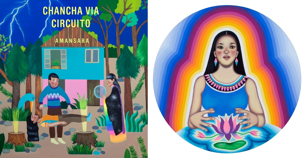 El holismo artístico se sostiene una concepción donde imágenes-música-danza-performance-objetos-vestimentas-creador-audiencia buscan articularse como acción participante colectiva cuyo hilo conductor es la experiencia espiritual. “A través del dinamismo de sus imágenes, la obra invita al espectador a relajarse y conectar”, dicta una nota de difusión de la última exposición de la artista Paula Duró [1], Hija del Rayo, en la Galería MAIA Contemporary de Ciudad de México (Agosto/Septiembre 2025). Nacida en Buenos Aires en 1981, Duró se estableció como novel pionera de una estética propia definida por un cruce entre imaginarios indígenas y orientalistas, arte pop y psicodelia amazonista (en la vertiente de las “plantas maestras”). Su asociación artística y sentimental con otros dos referentes de la escena, como ilustradora de la tapa de los primeros discos de Chancha Vía Circuito (nombre artístico del músico y productor Pedro Canale) y en los años recientes co-equiper de múltiples proyectos junto a Alejandro Sordi (cuadros, experiencias sonoras y visuales, esculturas de cartón, vestimentas y objetos), motorizó una concepción holista sobre la creación artística. La muestra “Línea del Sol” (2014), por ejemplo, integraba música en vivo mezclada con tarot, lectura de runas y estructuras coloridas, buscando la participación directa del espectador [2].