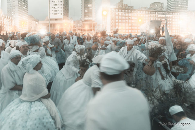 La procesión ocupa el largo de una cuadra, el ancho de una calle: ciento cincuenta hijos están parados en la rambla. La lluvia, a las siete y veinte, es solo una amenaza. La mayoría de blanco o celeste aunque algunos llevan abrigos rojos, amarillos, verdes, los colores de sus orixás.