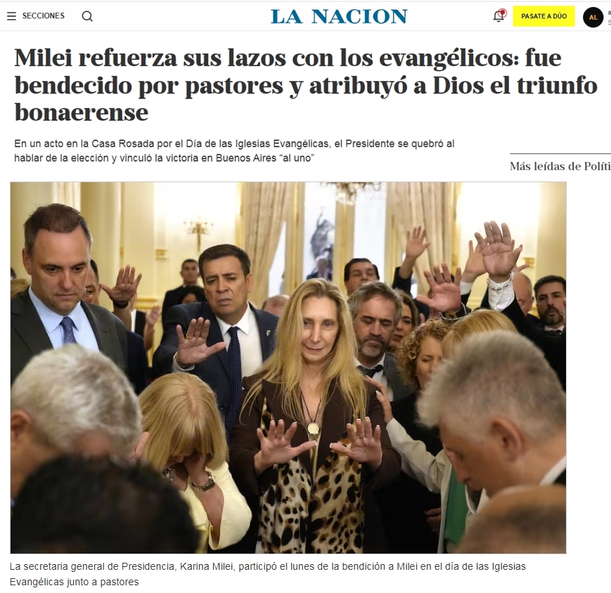 La foto que ganó más circulación, sin embargo, no fue de la propia ACIERA, sino una publicada por el gobierno y replicada por el diario La Nación (4/11/2025). En ella, pastores aparecen bendiciendo a autoridades, entre ellas Karina Milei, hermana del presidente y autodeclarada tarotista, lo cual tensiona con expectativas más tradicionales del campo evangélico.