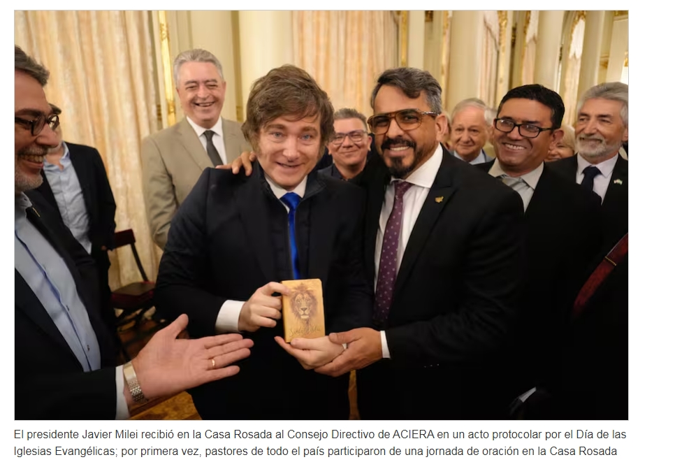 Ocho años después, en octubre de 2025, otra bendición tendría mucha más repercusión (en los medios y entre algunos pastores). Nuevamente con motivo del Día de las Iglesias Evangélicas (que a nivel nacional se conmemora por ley a partir de 2024), el presidente Javier Milei recibió a representantes de ACIERA (Alianza Cristiana de las Iglesias Evangélicas de la República Argentina) en Casa Rosada. La federación reúne a gran parte de las iglesias pentecostales y neopentecostales del país. Vale la pena recordar que federaciones como ACIERA son una forma de organización logística y representación pública, pero no teológica. La afiliación no implica uniformidad doctrinal ni política.